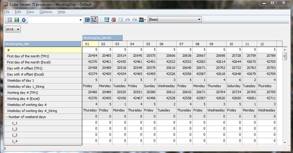 ['#'] = Stet; ['First day of the month (TM1)'] = N: Dayno( !WorkingDay_Year | '-' | !WorkingDay_Month | '-01' ); ['First day of the month (Excel)'] = N: ['First day of the month (TM1)'] + 21916; ['Day with # offset (TM1)'] = N: ['First day of the month (TM1)'] + ['#'] - 1; ['Day with # offset (Excel)'] = N: ['First day of the month (Excel)'] + ['#'] - 1; # Assuming 1 = Monday, etc., 7 = Sunday ['Weekday of day 1'] = N: Round( Mod( ['First day of the month (TM1)'] + 21915 - 0.5, 7)); ['Weekday of day 1_String'] = S: If( ['Weekday of day 1'] = 1, 'Monday', If( ['Weekday of day 1'] = 2, 'Tuesday', If( ['Weekday of day 1'] = 3, 'Wednesday', If( ['Weekday of day 1'] = 4, 'Thursday', If( ['Weekday of day 1'] = 5, 'Friday', If( ['Weekday of day 1'] = 6, 'Saturday', 'Sunday' )))))); ['Weekday of working day #'] = N: Round( Mod( ['Working day # (TM1)'] + 21915 - 0.5, 7)); ['Weekday of working day #_String'] = S: If( ['Weekday of working day #'] = 1, 'Monday', If( ['Weekday of working day #'] = 2, 'Tuesday', If( ['Weekday of working day #'] = 3, 'Wednesday', If( ['Weekday of working day #'] = 4, 'Thursday', If( ['Weekday of working day #'] = 5, 'Friday', If( ['Weekday of working day #'] = 6, 'Saturday', 'Sunday' ))))))); # Main calculation ['Working day # (TM1)'] = N: ['Day with # offset (TM1)'] + Attrn( 'WorkingDay_Msr', Trim( Str( ['Weekday of day 1'], 2, 0 )) | '_' | Trim( Str( ['#'], 2, 0 )), 'Number of weekend days' ); ['Working day # (Excel)'] = N: ['Working day # (TM1)'] + 21916;